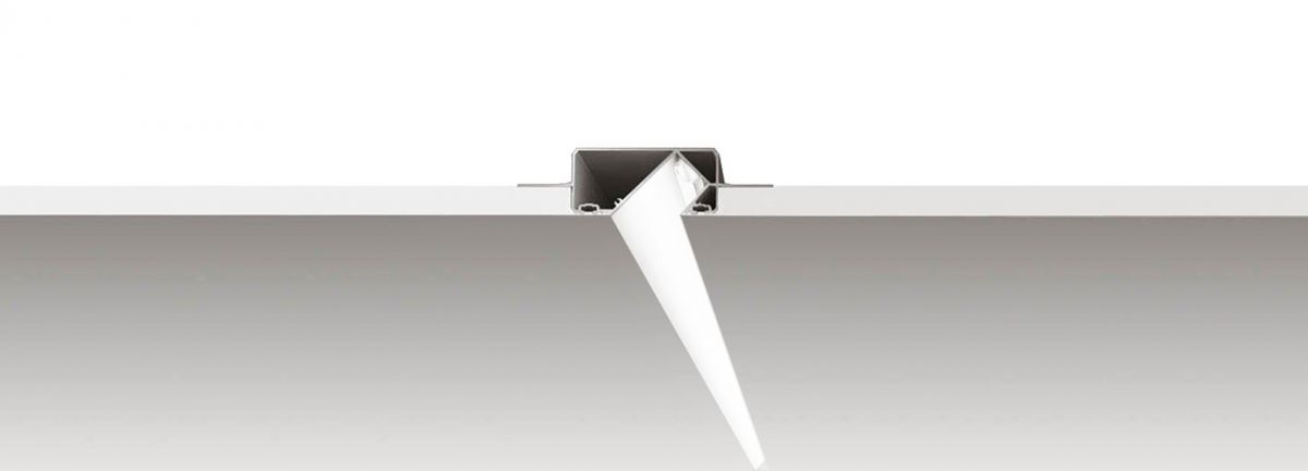 A trimless recess mounted linear LED luminaire manufactured from extruded aluminium and finished in matt white with an opal diffuser. Designed for installation in single layer 12.5mm Gypsum plasterboard.