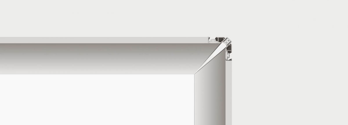 A trimless recess mounted linear LED luminaire manufactured from extruded aluminium and finished in matt white with an opal diffuser. Designed for installation within internal 90° corner junctions using single layer 12.5mm Gypsum plasterboard.