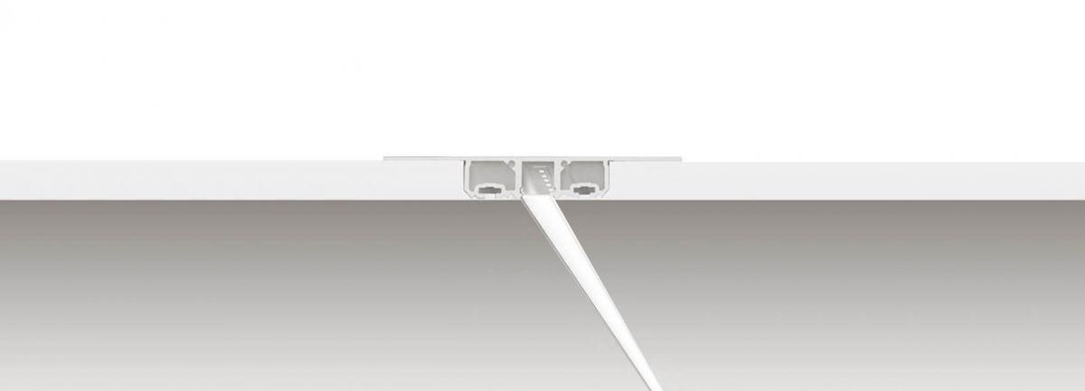 A trimless recess mounted linear LED luminaire manufactured from extruded aluminium and finished in matt white with an opal diffuser. Designed for installation in single layer 12.5mm Gypsum plasterboard.