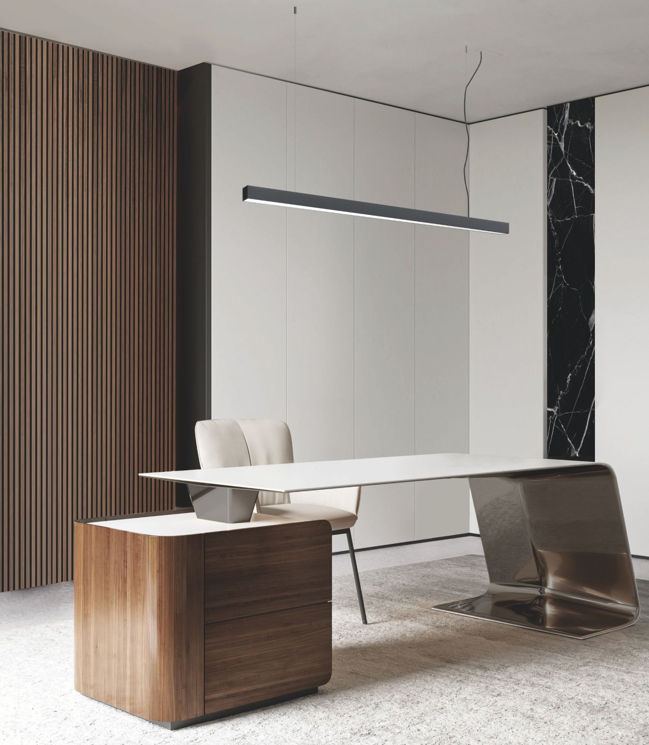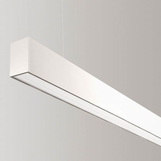 Extruded aluminium profiles 50 x 64.5 of the MX series with a polycarbonate diffuser retracted by about 21mm with respect to the edge of the profile itself to allow a more comfortable emission, lowering the direct luminance. They can be installed on the ceiling or suspended. Equipped with MKC LED module kit. Available in black, white and satin anodised aluminium finishes.