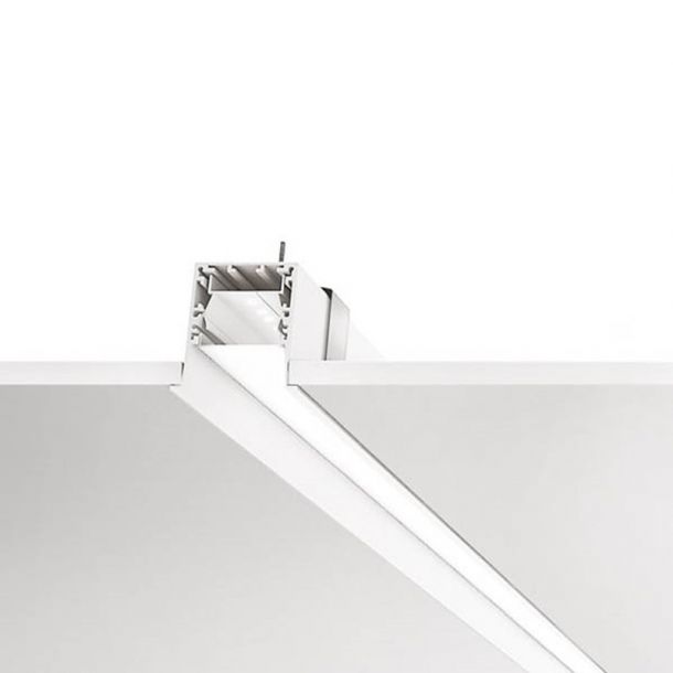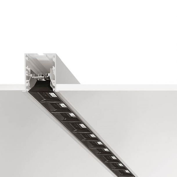 Modular system for single luminaire or continuous rows, made of aluminium in a minimal version with recessed low contrast diffuser for general light with opal screen, high contrast with prismatic diffuser with controlled luminance.