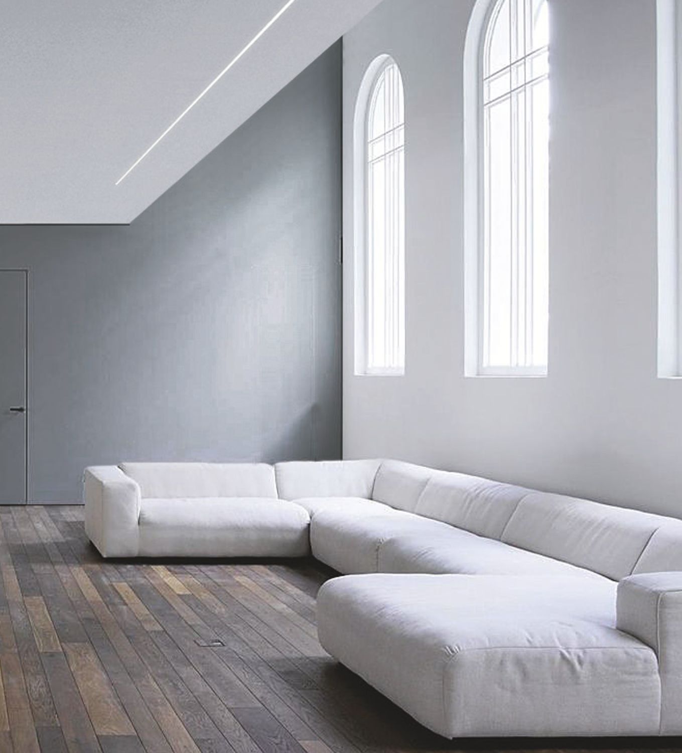 Extruded aluminium profile matt white for total hide recessed installation in the plasterboard.