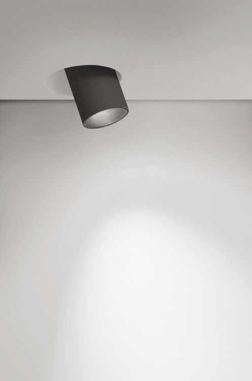 Round trimless recessed fixture for indoor lighting, made of aluminium in the finishing white or black, with a telescopic cylinder projector inside that comes white or black. The spotlight is equipped with an anodized ring in the finishing black to reduce the luminance.