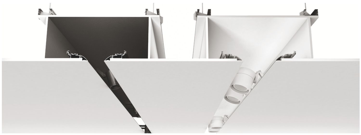 The system GROOVE consists of a pair of ML_30 profiles installed opposite each other, bounding the aperture in the plasterboard, and covered with sheet steel painted in standard matt black or white.