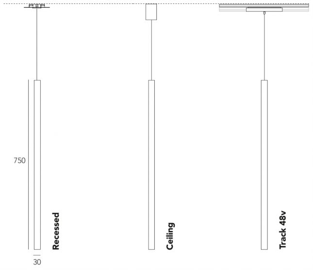 Slim suspended suitable for recessed ceiling installation and on 48v track design track. Spot emission 26 ° with aspherical glass lens.