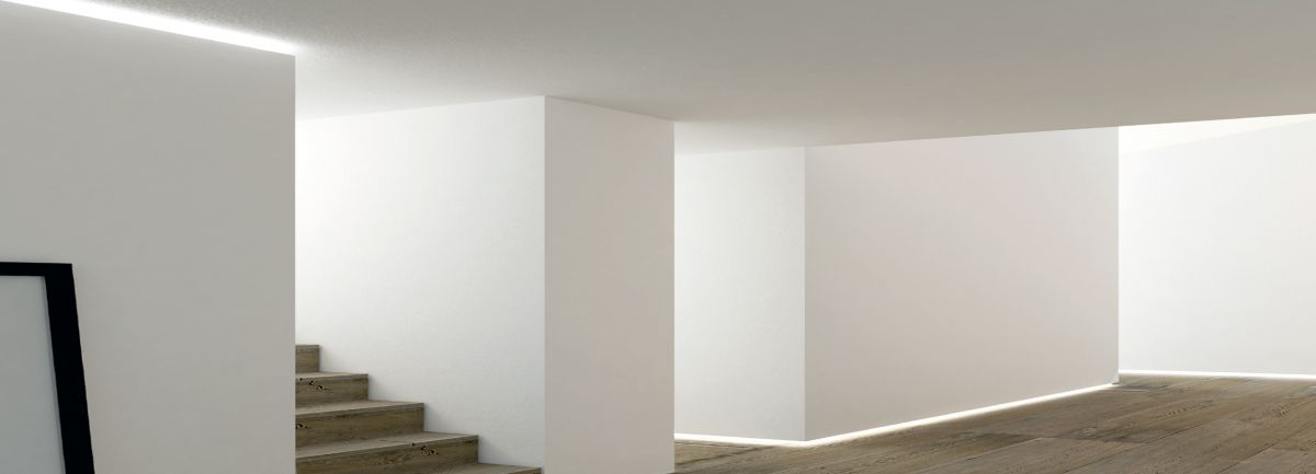 A trimless recess mounted linear LED luminaire manufactured from extruded aluminium and finished in matt white with an opal diffuser. Designed for installation at the ceiling/wall/floor junction, to create a consistent wash of light around the room perimeter.