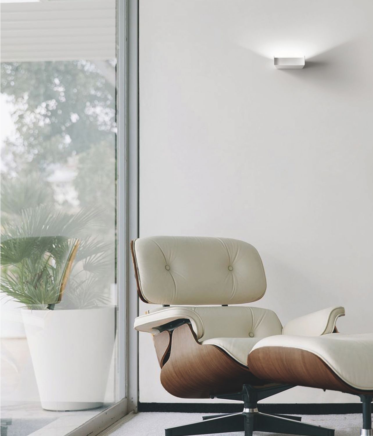 Designed for an easy and refined furnishing, the Mild wall lamp keeps a precise formal and material identity everywhere. Made of white silk or black painted steel sheet, it houses an indirect emission LED lamp.