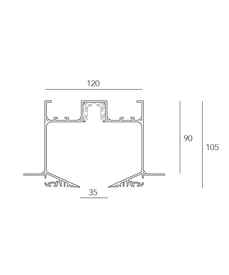 Extruded black anodised aluminium channel, complete with 48v concealed track, creating a 35mm wide ceiling slot.